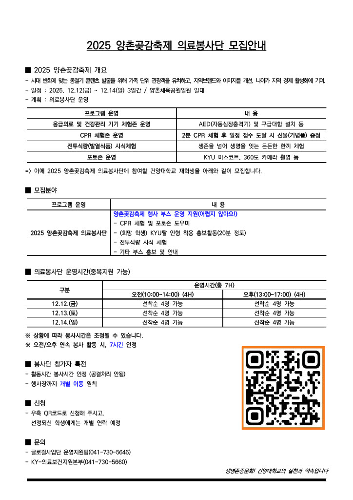 * 봉사내용 - 응급의료 및 건강관리 기기 체험존 운영 - CPR 체험존 운영 - 전투식량(발열식품) 시식체험 -포토존 운영 * 봉사활동 관련 자세한 내용은 모집안내 공고문 확인바랍니다. * 신청방법: QR코드로 신청